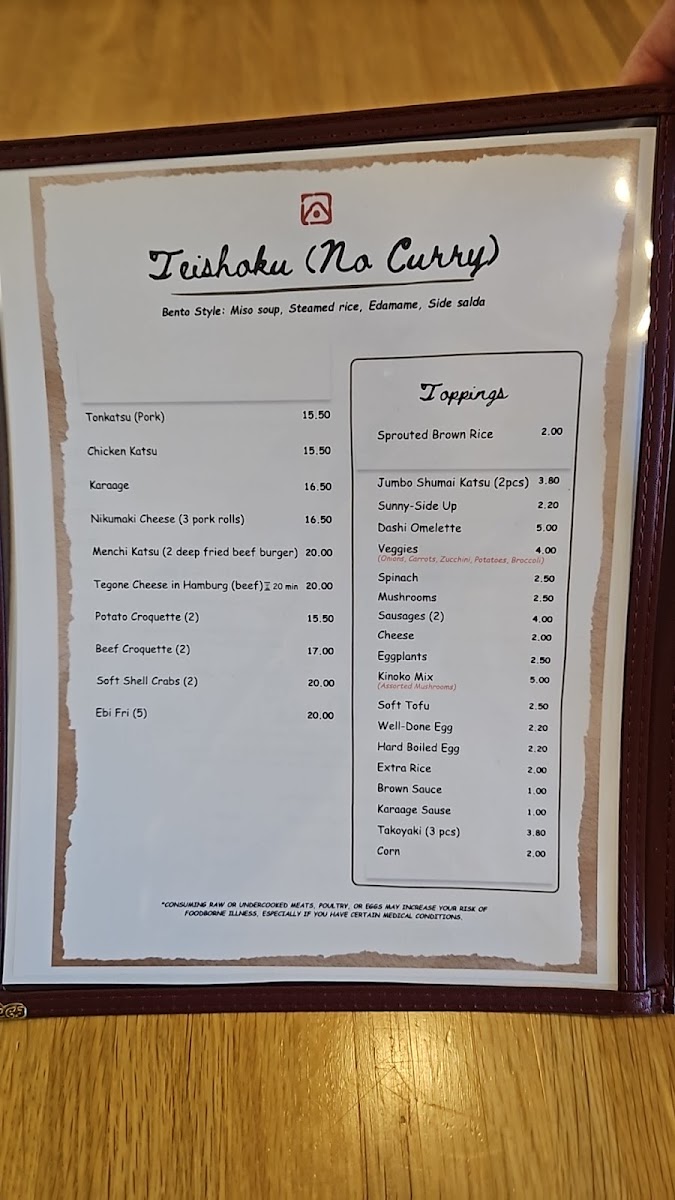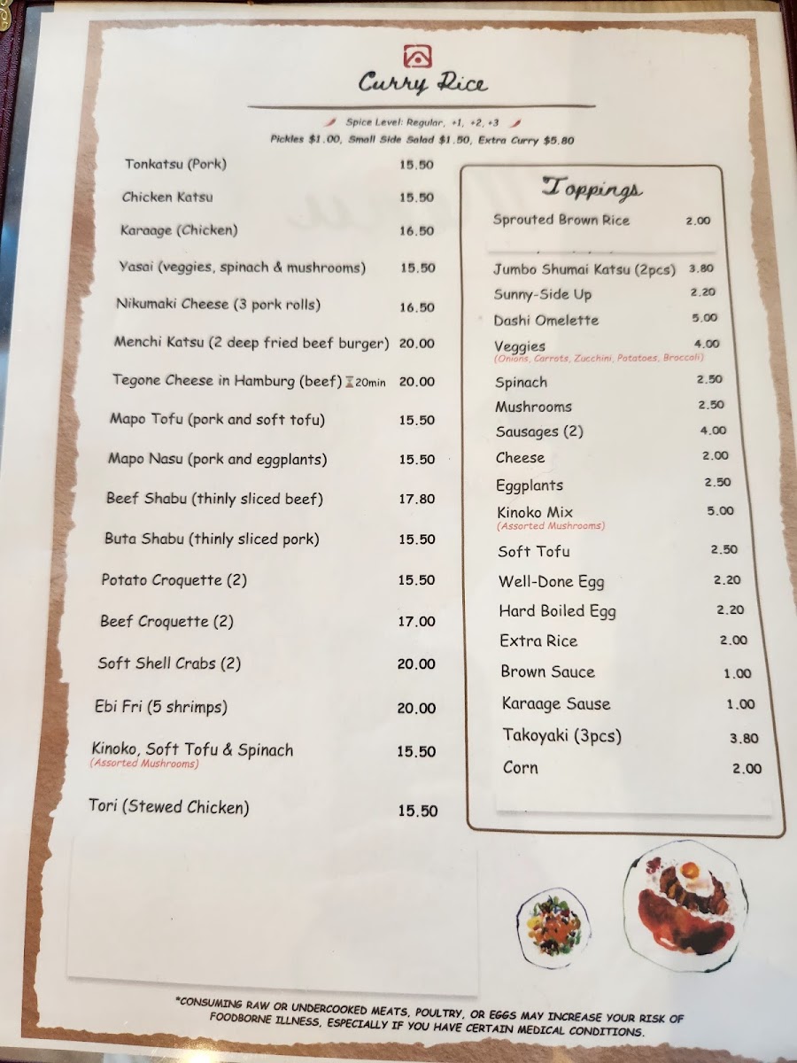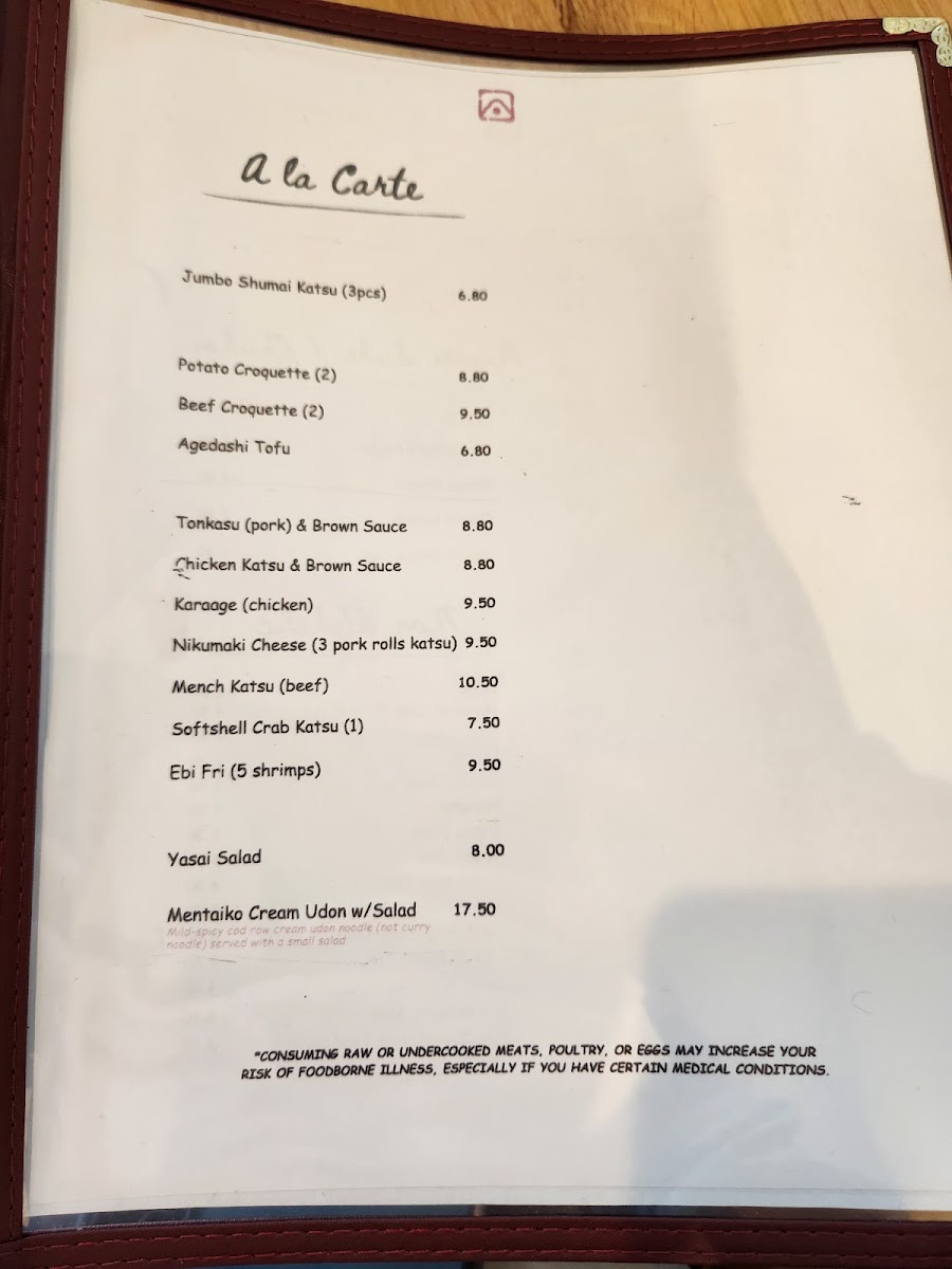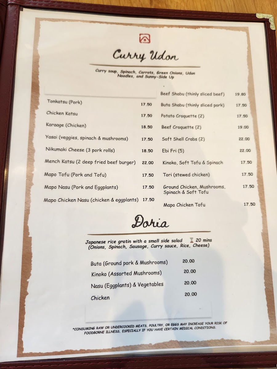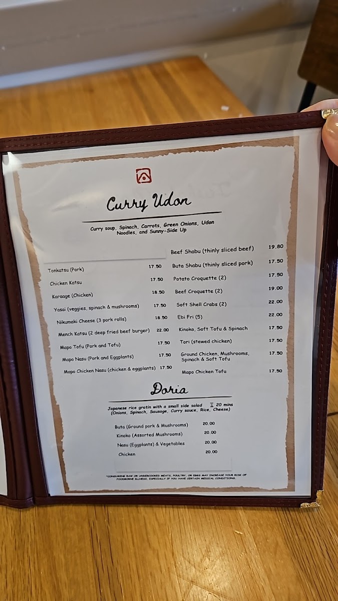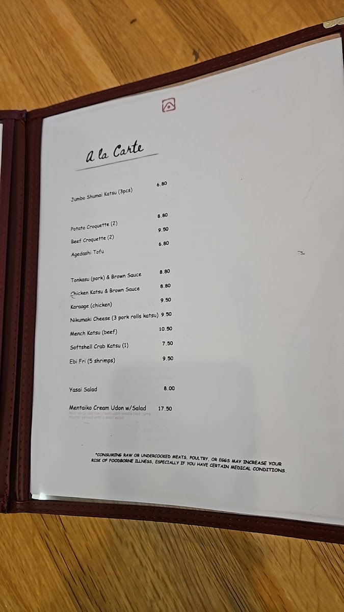 Curry udon dishes are served with options like chicken katsu, tonkatsu, menchi katsu, or fried shrimp, often topped with a sunny side up egg. The menu also offers donburi-style meals including chicken-katsu don and katsudon, providing rice bowls with breaded and fried meats. Additional items readily available as a la carte include karaage, deep-fried pork cheese roll, and mini chicken katsu.