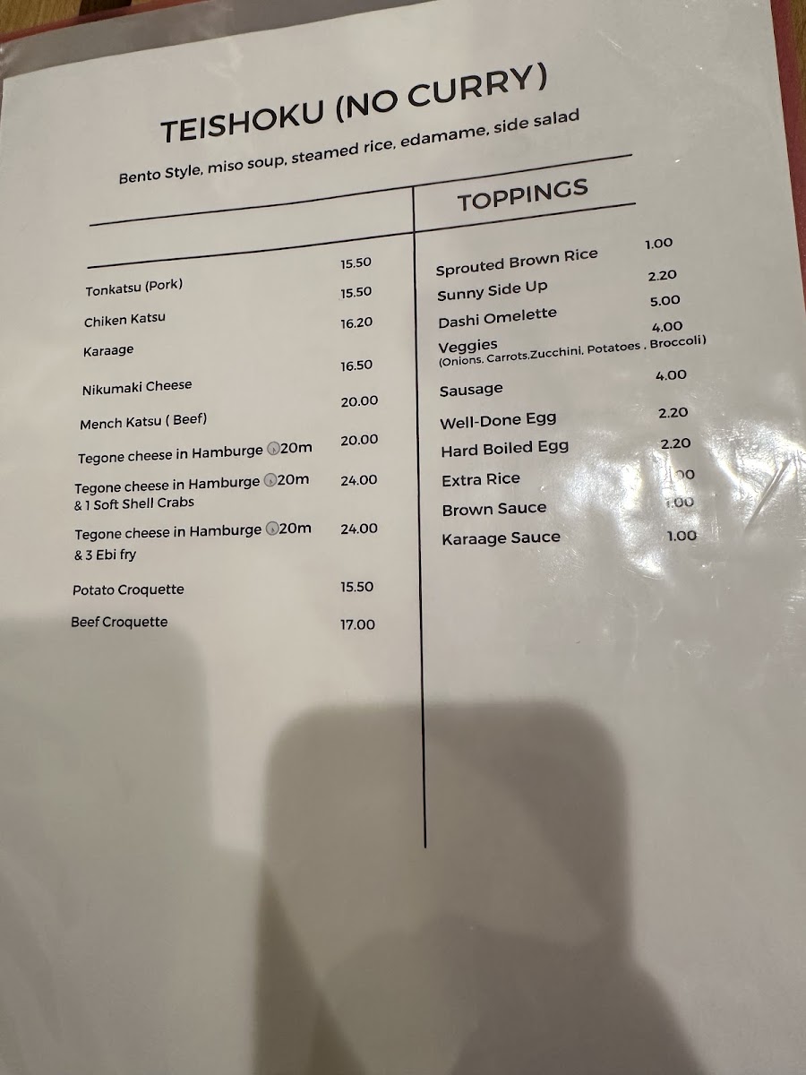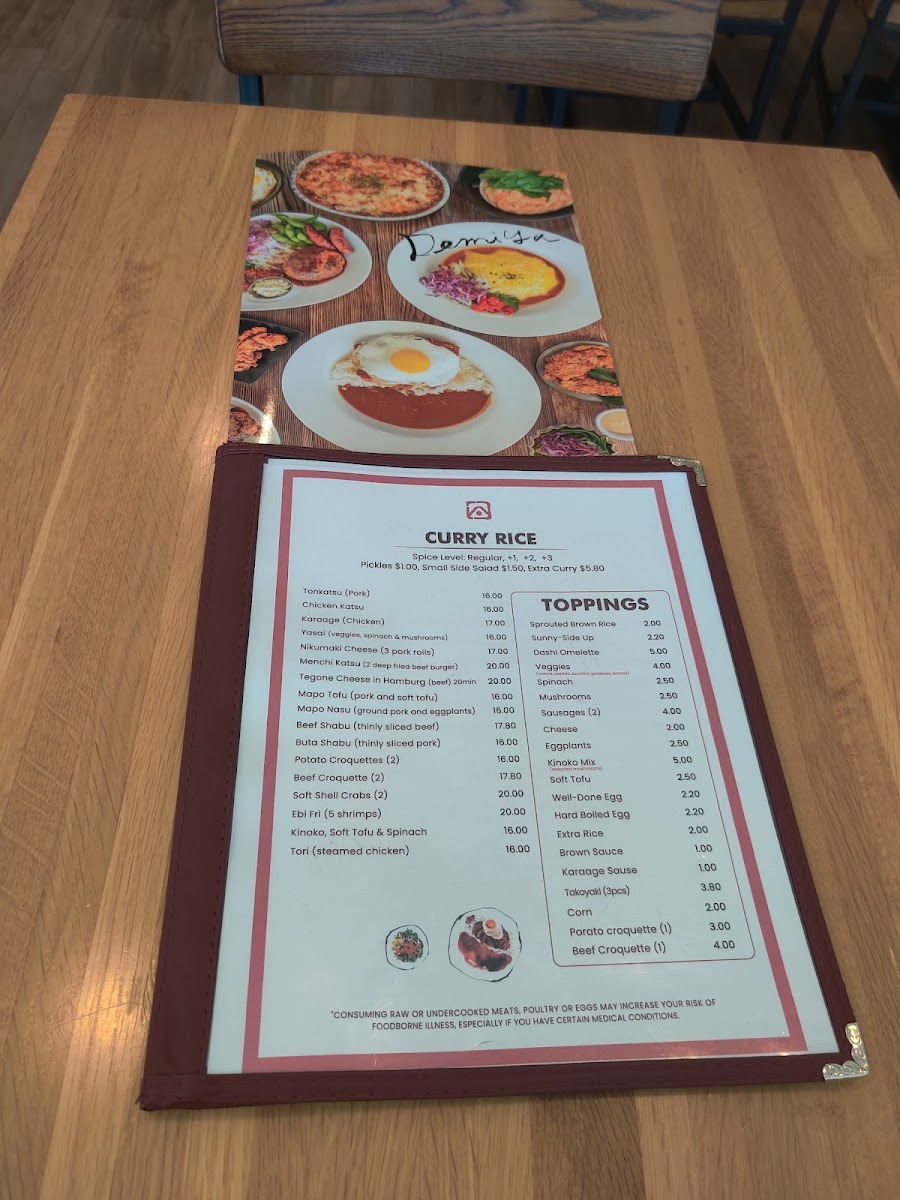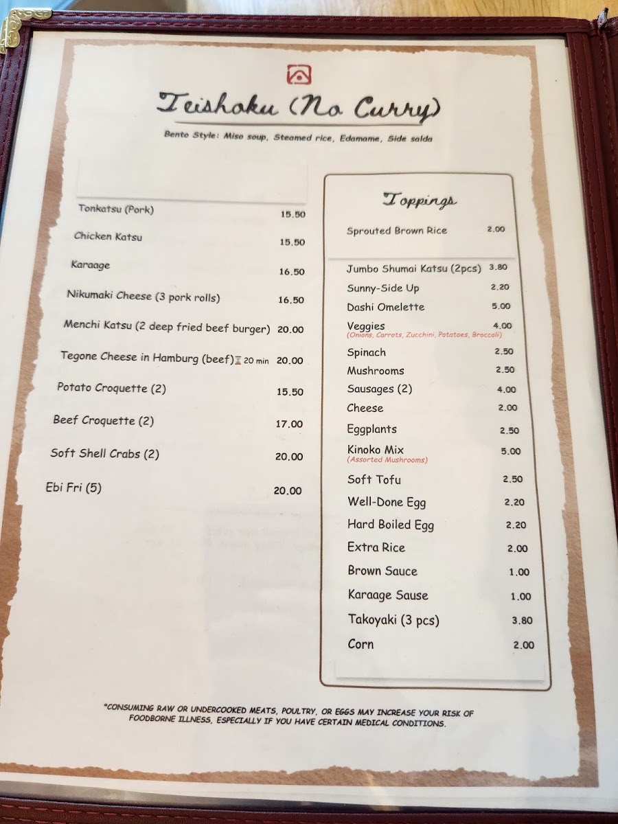 The menu features a variety of Japanese curry dishes, udon noodle soups, and set meals (teishoku) that highlight traditional flavors and ingredients. Visitors can find a selection of curry rice options with different toppings such as softshell crab, vegetables, mapo tofu, and deep-fried pork cheese rolls. The teishoku sets typically include a combination of protein choices such as beef hamburg, shrimp katsu, and softshell crab, accompanied by miso soup, steamed rice, edamame, and salad.